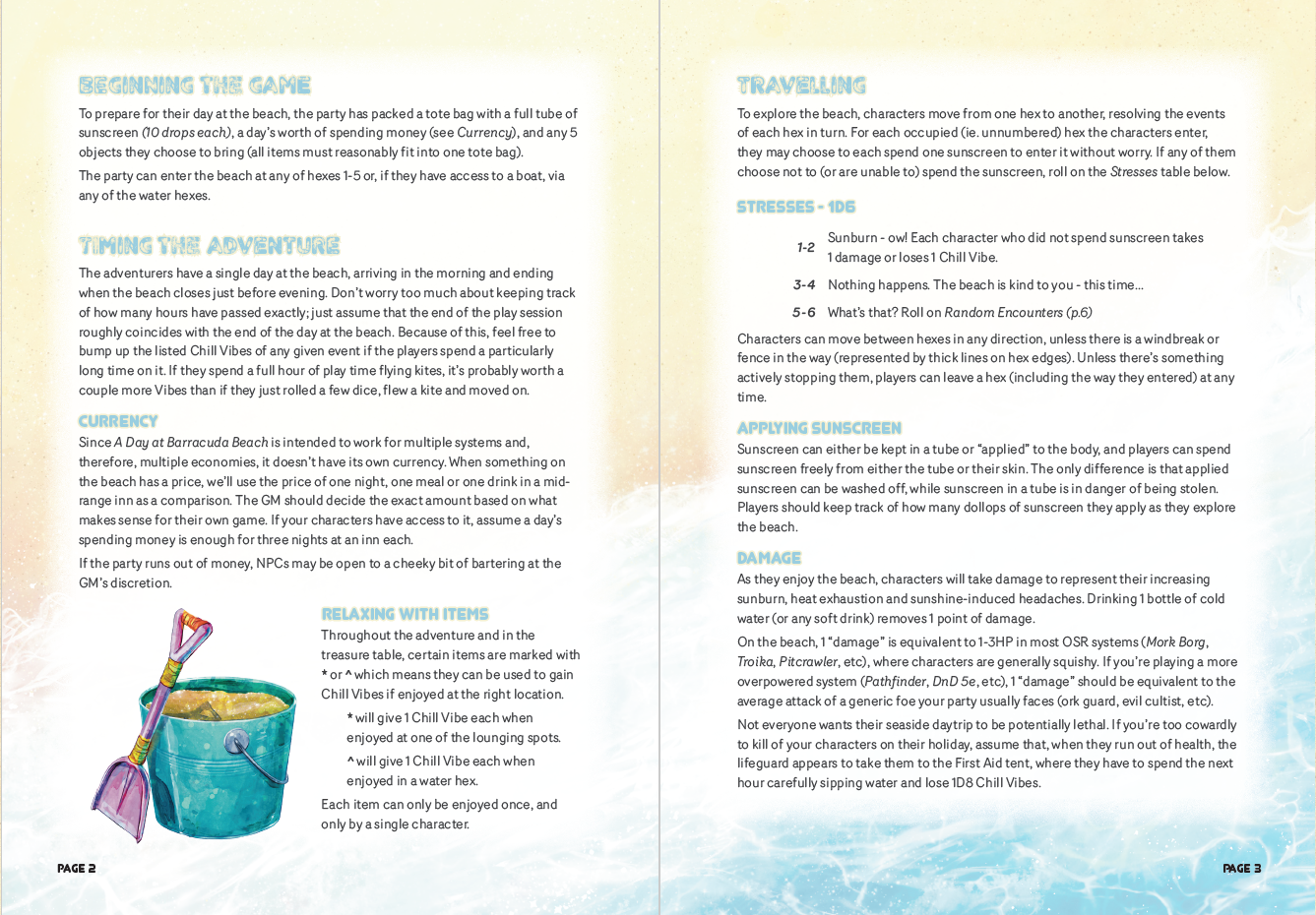 A Day at Barracuda Beach is a one-shot hexcrawl designed to fit any fantasy or OSR-style RPG campaign. During the game players will explore the beach in search of fun and relaxation, enjoying such activities as building sandcastles, playing mini-golf and topping up their sunscreen.