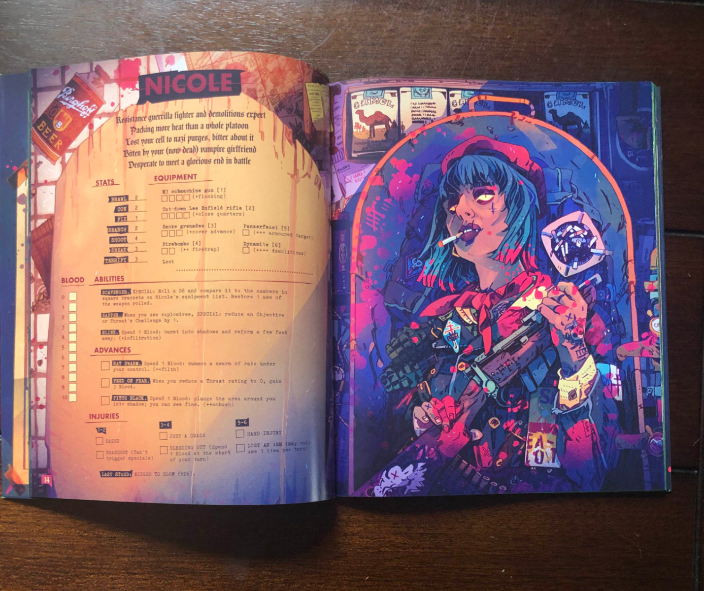 - Six beautiful pre-generated player characters ready to smash up some fascists: a monied occultist, a cowboy ghoul, an East London necromancer, an armed and dangerous nihilist, a fighter pilot with a parasite soul and Flint, a half-bat half-man thing with good intentions.