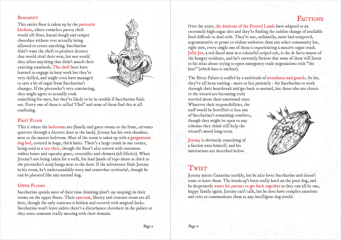 After a messy break-up, the great wizard Saccharino has turned their once candy-coated domain into a sour and savoury nightmare. Now, one brave adventurer must risk life, limb and tastebuds to infiltrate their palace and retrieve something for the wizard’s ex-lover. The target: Jeremy the dog. The absolutely normal, not-at-all terrifying regular dog. Easy gold for an animal-loving pitcrawler!