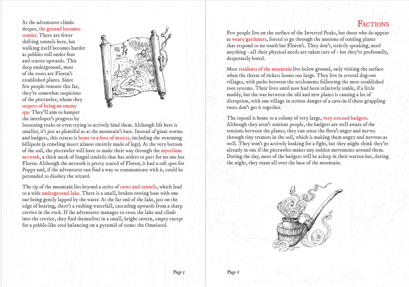 When the pitcrawler is contacted by the wizard Floren’s disgruntled former apprentice, they offered a simple job: steal the the Omniseed - an artifact of incredible horticultural power. However, simple does not mean easy, as the seed currently resides at the peak of an upside-down subterranean mountain engaged in a brutal inter-foliage war. Herbicide is on the menu, and the adventurer is the main course!